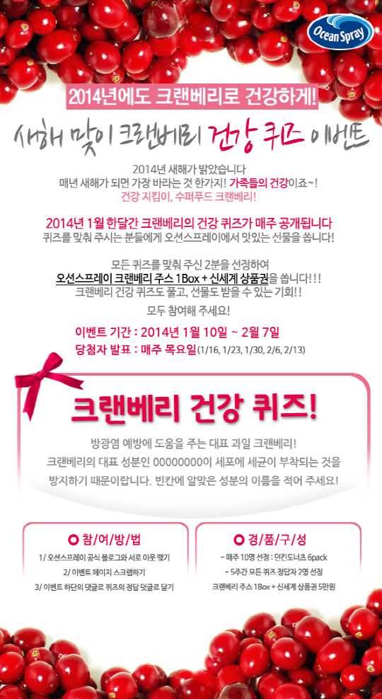 미국 크랜베리 기업 오션스프레이가 '새해맞이 크랜베리 건강퀴즈 이벤트'를 마련했다.