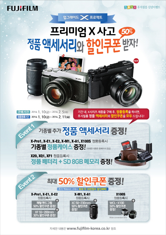 인기 렌즈 3종과 광각 컨버전 렌즈, 핸드그립을 최대 50% 저렴하게 구매할 수 있는 파격 할인쿠폰도 제공한다. X-Pro1, X-E1, X-E2에는 메탈 핸드그립 50% 할인쿠폰과 XF55-200mm 렌즈 30% 할인쿠폰을, X-M1, X-A1에는 XC50-230mm렌즈 50% 할인쿠폰, X100S에는 광각 컨버전 렌즈 WCL-X100 50% 할인쿠폰을 각각 증정한다. X-Pro1, X-E1, X-E2, X-M1, X-A1의 경우 렌즈키트는 물론, 바디만 구매한 고객도 이벤트에 참여할 수 있다. 쿠폰 사용기간은 발급일로부터 30일이며 공식 홈페이지에서 사용 가능하다.