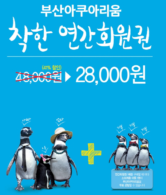 또한 착한 연간회원권을 이용할 경우 1년간 부산아쿠아리움 무료 입장은 물론, 3D라이더를 50% 할인 받아 이용할 수 있으며, 다양한 기념품도 10% 할인된 가격에 구매할 수 있다. 더불어 동반 최대 4명까지 20% 할인된 가격에 입장이 가능하다.