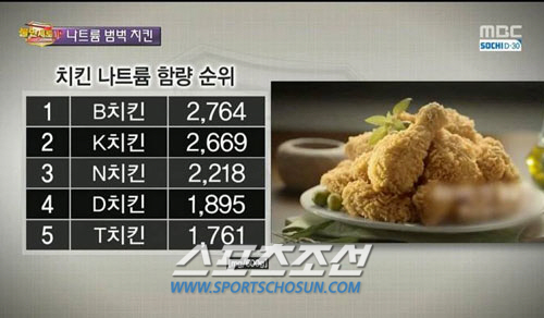불만제로 제작진이 밝힌 브랜드별 치킨 나트륨 함량순위는 1위 B치킨 2,764, 2위 K치킨 2,669, 3위 N치킨 2,218, 4위 D치킨 1,895, 5위 T치킨 1,761(단위 mg/600g)을 기록, 높은 수치를 드러슌다.