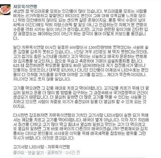 9일 '자유육식연맹'은 페이스북을 통해 "세상엔 참 부끄러운 줄 모르는 인간들이 많이 있다"고 비난하며, "자유육식연맹의 기치인 고기사랑 나라사랑이 실현되기 위해서는 제값을 치르고 고기를 먹어야 한다"고 밝혔다.