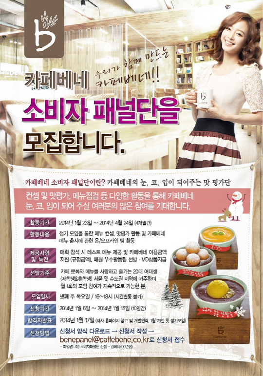 오는 15일까지 신청 가능하며 카페베네 공식 홈페이지(www.caffebene.co.kr)에서 참가 신청서를 다운 받아 작성한 후, 이메일(benepanel@caffebene.co.kr)로 접수하면 된다.