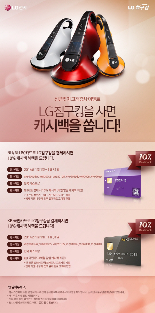 이벤트는 1월 31일까지 진행되며 전국 LG전자 Bestshop에서 침구킹(VH9200DSW, VH9200DS, VH9201DS, VH9202DS, VH9200D, VH9201D)을 구입하면 다음달 말일에 캐시백을 지급받는다.