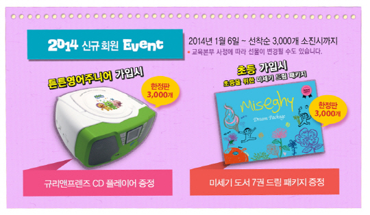 이번 이벤트는 2014년을 맞이해 튼튼영어의 신규 회원들에게 뜻 깊은 새해 선물을 증정하고자 마련되었다. 튼튼영어주니어 가입 시 튼튼영어의 규리앤프렌즈의 캐릭터들이 새겨진 CD 플레이어를 3000명에게 증정하고 초등학생 회원 가입 시에는 초등학생들의 상상력과 창의력을 키워주는 미세기 도서 7권으로 구성된 '드림 패키지'를 3000명 한정으로 증정한다.