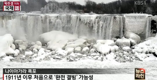 북미 지역을 강타한 살인적인 한파로 인해, 세계적인 관광명소 나이아가라 폭포가 얼어붙었다.