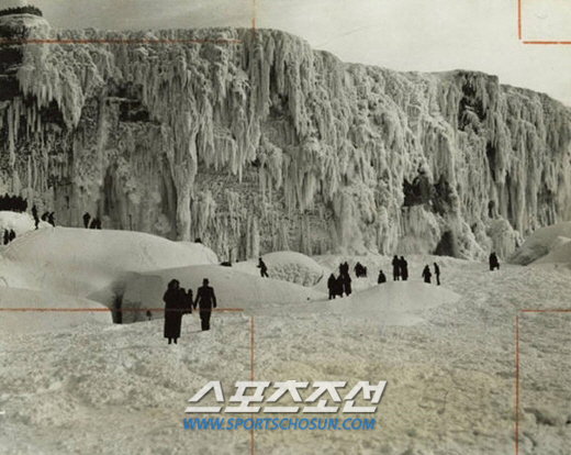 이는 지난 1911년 나이아가라 폭포 사진으로, 흑백 사진 속에는 엄청난 높이를 자랑하는 나이아가라 폭포가 강추위에 얼어붙어 거대한 빙벽을 이루고 있는 모습이 담겨있다.