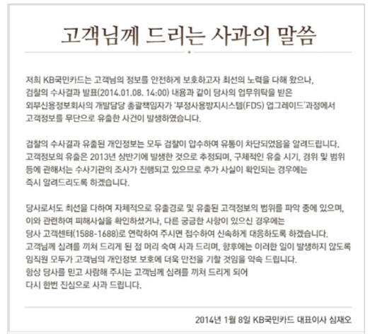더욱이 이번 개인정보 유출 대란 이후 KB국민카드가 보여준 행보는 금융 소비자들의 불신을 부채질하고 있다. 심재오 사장이 취임 직후 내건 '고객 불편해소와 소비자보호' 기치와도 거리가 멀다는 지적이다.