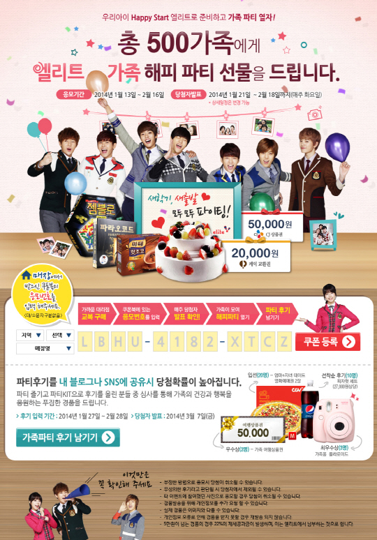 '해피 파티 KIT'에는 2만원 상당의 케이크 교환권 및 5만원 상당의 외식 상품권, 보드게임과 핫초코 등 가족들이 마음을 터놓고 어울릴 수 있는 다양한 파티 용품들이 들어있다. '해피 파티' 쿠폰은 2월 16일까지 응모 가능하며 1월 21일부터 2월 18일까지 5주간 매주 화요일 100가족을 선정해 발표한다.