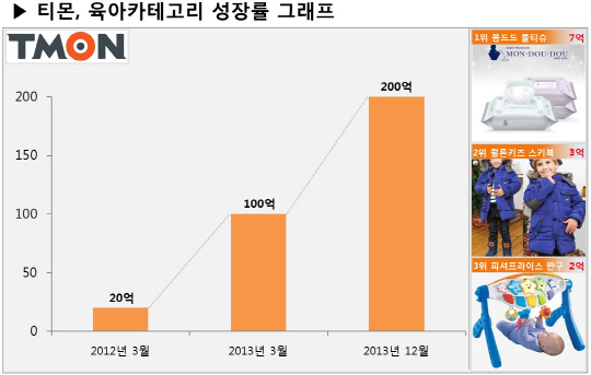 티켓몬스터가 육아 부문 월 거래액 200억원을 돌파하는 등 육아 쇼핑 채널로 주목 받고 있다.