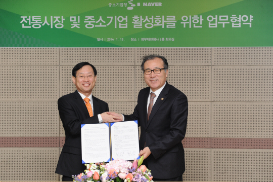 네이버㈜(대표이사 사장 김상헌)와 중소기업청(청장 한정화)은 13일 정부대전청사 중소기업청에서 전통시장과 중소기업 활성화를 위한 포괄적 업무협약을 체결했다.