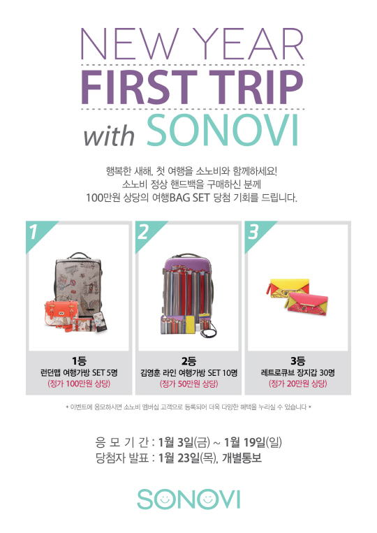 감성 일러스트 잡화 브랜드 소노비(SONOVI)가 2014년 새해를 맞아 베스트셀러 여행 가방을 증정하는 '2014 퍼스트 트립(First trip) 이벤트'를 실시한다.