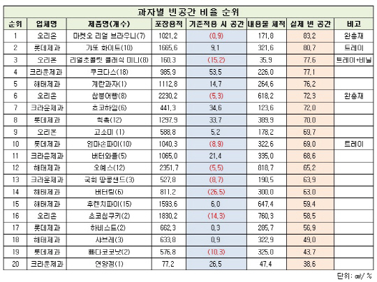 내용물이 포장 부피의 절반 이하인 빈 공간 비율 50% 이상 제품은 해태제과 '후렌치파이'(59.4%), 오리온 '초코칩쿠키'(58.5%), 롯데제과 '하비스트'(56.9%)등 3개였다.