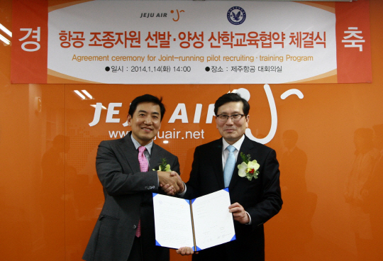 14일 오후 2시 제주항공 서울본사에서 제주항공 최규남 사장과 항공대 이강웅 총장 등이 참석한 가운데 조종사 선발 및 우수자원 양성 등을 위해 상호 지원한다는 내용의 협약식이 진행됐다.