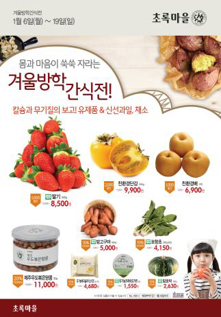 겨울철에는 특히 비타민 섭취에 신경을 써야 한다. 특히 딸기에는 단백질과 당질, 섬유, 칼슘, 인, 철분, 비타민 A, 비타민 B, 비타민 C 등 다량의 영양분이 대량 함유돼 있으며 특히 비타민C는 감귤보다 많으며 사과에 비해서는 16배나 많다. 특히 과피가 없어 바로 먹는 딸기는 씻을 때 자칫하면 짓무르기 쉽기 때문에 구입 시 꼭 무농약으로 재배된 과일을 고르는 것이 좋다. 초록마을 무농약 딸기는 5천원 할인된 가격인 8천5백원에 판매한다. 초록마을 무농약딸기(500g)는 경남 진주시 대평면 대평리의 딸기 농가에서 생산한 딸기(품종: 설향)로 향과 당도가 높은 것이 특징이다.