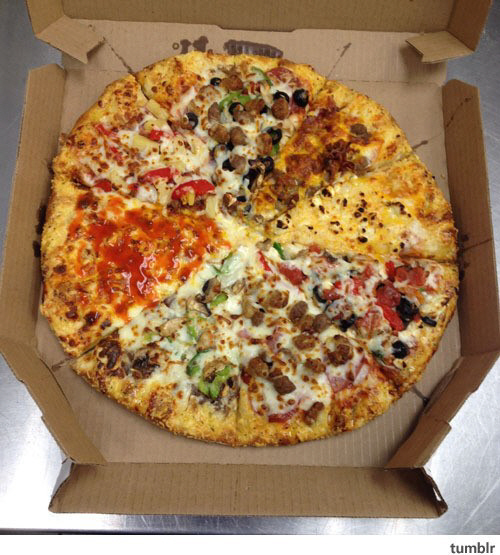 공개된 사진 속에는 서로 다른 피자 종류 8조각이 합쳐져 한판에 담겨 있는 모습이다.