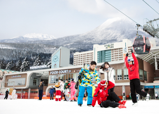 스키시즌이 절정을 맞고 있다. 추운 겨울 설원을 질주하는 스키는 에너지 소모량이 많아 제 때에 잘 챙겨 먹어야 한다. 스키장 내 맛집이 중요한 이유다. 사진은 대명 비발디스키월드를 찾은 스키어-보더들이 푸드코트 앞에서 포즈를 취하고 있다.