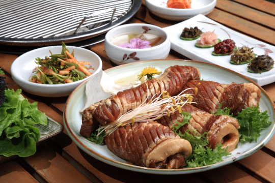 야외민속주점 시골장터(033-493-7998)의 참나무 삼겹살 BBQ도 맛이 좋다. 꼬치에 꽂은 통삽겹살을 참나무 장작에 구워먹는 맛이 일품이다. 삼겹살 600g. 3만원