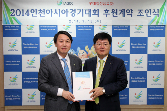 15일 롯데칠성음료는 인천 송도에 위치한 아시안게임 조직위원회 사무실에서 이재혁 롯데칠성음료 대표이사, 권경상 조직위 사무총장이 참석한 가운데 스폰서급 공식후원계약을 체결했다.