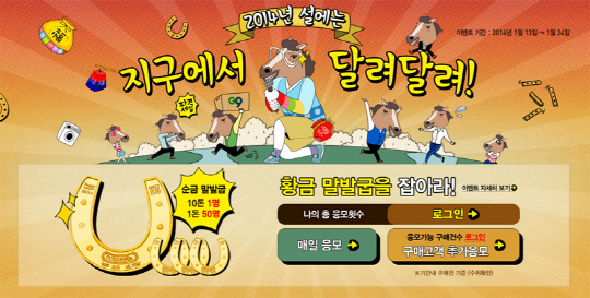 이번 설 프로모션에서는 '황금 말발굽을 잡아라' 코너를 통해 말의 해를 맞아 순금 말발굽을 증정하는 이벤트도 진행한다. 추첨을 통해 뽑힌 1명에게 순금 37.5g(10돈)을 증정하며, 50명에게는 3.75g(1돈)을 제공한다. 이벤트 종료 후 일괄 추첨을 통해 당첨자가 선정될 예정으로, G9 회원이라면 누구나 기간 내 1일 1회 응모 할 수 있으며 G9 상품 구매 고객은 수취 확인 완료 건당 1회씩 추가 응모 가능하다.