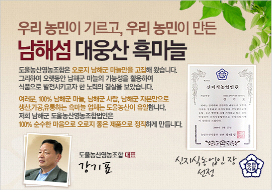 마늘 업계 최초의 브랜드, '도울 게르마늄 마늘'을 생산하는 도울농산영농조합법인(대표 강기표, 이하 도울농산)은 지난 1996년 설립되어 남해마늘을 전국에 알리고 있는 영농조합이다.