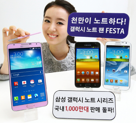 삼성전자는 2011년 처음 선보인 '갤럭시 노트'를 시작으로 '갤럭시 노트 Ⅱ'와 '갤럭시 노트 3'까지 2년 1개월만에 국내시장 1,000만 대 판매기록을 달성했다.