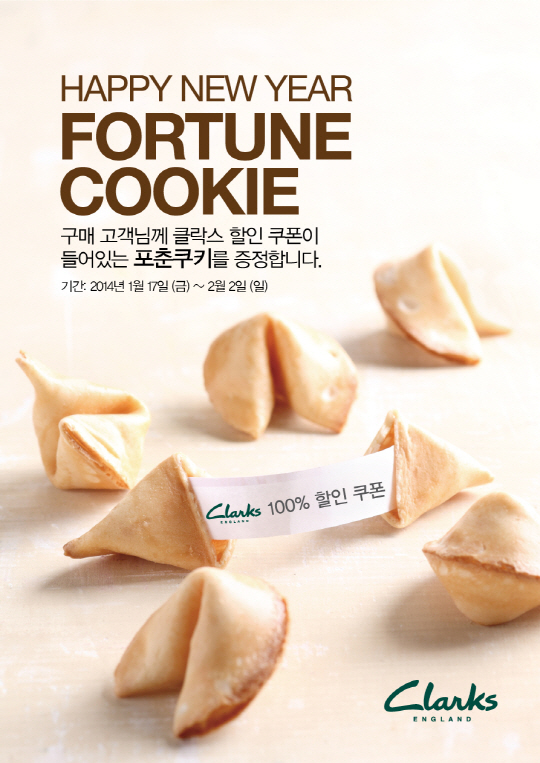 금강제화에서 운영하는 영국 캐쥬얼 슈즈 브랜드 클락스(Clarks)가 슈즈 구입시 할인 쿠폰을 주는 '포춘 쿠키(Fortune Cookie) 이벤트'를 진행한다.