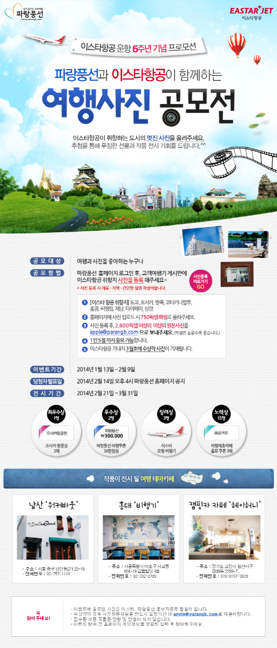 이스타항공이 운항 6주년을 맞아 파랑풍선 여행사와 함께 이스타항공이 운항하는 해외 여행지 사진 공모전을 진행한다. 여행과 사진을 좋아하는 누구나 참여가 가능한 이번 공모전은 이스타항공이 운항하는 도쿄, 오사카, 홍콩, 코타키나발루, 씨엠립, 방콕, 대만, 심양, 제남의 여행 사진을 제출하면 된다.