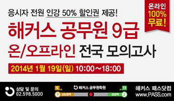 공무원 시험전문 교육기관 해커스 패스닷컴 공무원학원(www.PASS.com)이 19일 9급 공무원 국가직 시험의 온, 오프라인 전국 모의고사를 실시한다.