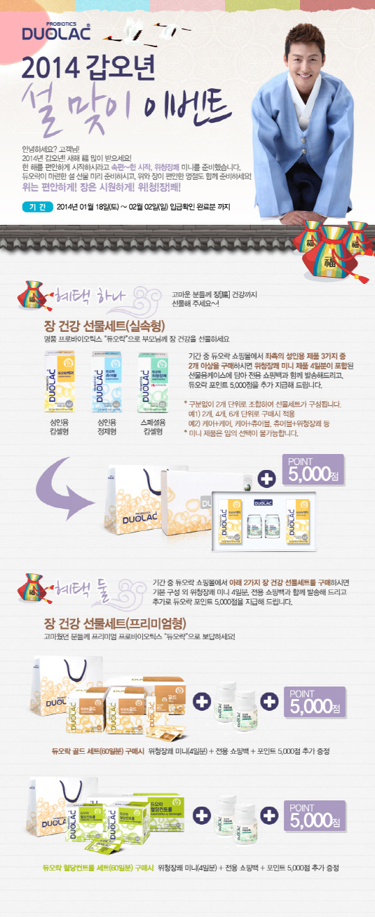 프로바이오틱스 유산균 전문기업 ㈜쎌바이오텍(대표 정명준)은 오는 29일까지 민족 최대의 명절 설을 앞두고 '듀오락 2014 갑오년 설 맞이 이벤트'를 자사 쇼핑몰 '듀오락몰(www.duolac.co.kr)'에서 진행한다.