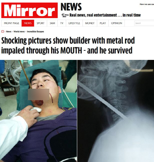 쇠막대에 입과 목을 관통당한 남성이 기적적으로 생존했다.
