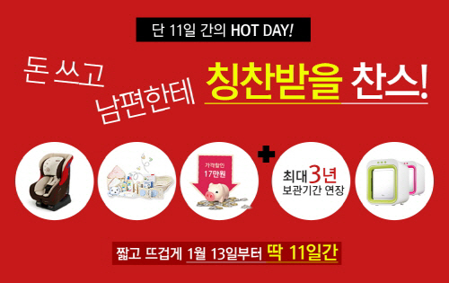 특히 베이비페어라는 특징을 그대로 살려, 아이코드 가입기간 최대 3년 연장과 다이치 듀엘 시즌2 오가닉 카시트(소비자가 46만원 상당), 아가방앤컴퍼니 출산패키지 15종 세트(소비자가 40만원 상당), 아이코드 가입 17만원 할인 중 택일의 기회를 주며, 나아가 유팡 젖병 소독기(소비자가 15만4000원 상당)를 이번 '아이코드 온라인 베이비페어' 이벤트 기간 동안 전 고객에게 증정하는 파격적인 혜택을 진행하고 있다.