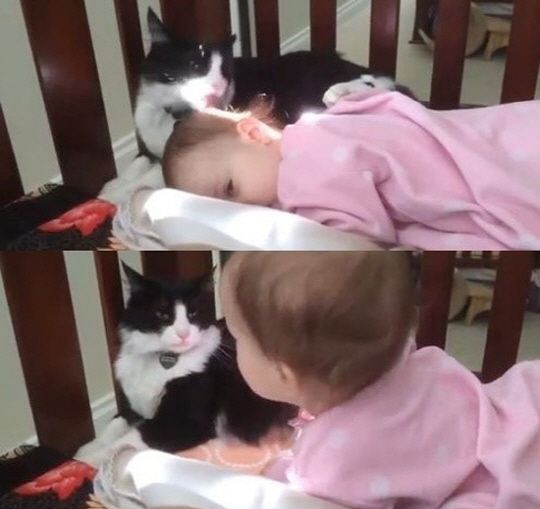 공개된 영상에는 엎드려 있는 아기를 핥아주는 고양이의 모습이 담겨져 있다. 아기는 이 고양이의 행동을 즐기는 듯 하더니 이내 일어나 고양이를 바라봤다. 그러나 고양이는 언제 그랬냐는 듯이 다른 곳을 쳐다보다가, 아기가 다시 엎드리자 머리를 또 핥으며 웃음을 자아낸다.