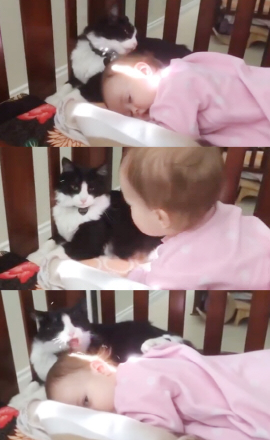 공개된 영상에는 엎드려 있는 아기의 머리를 핥아주는 고양이의 모습이 담겨져 있다. 아기는 이 고양이의 행동을 즐기는 듯 하더니 이내 일어나 고양이를 바라봤다. 그러자 고양이는 언제 그랬냐는 듯이 도도한 표정을 짓다가, 아기가 다시 엎드리자 머리를 또 핥아주는 지극정성(?)인 모습을 보인다.