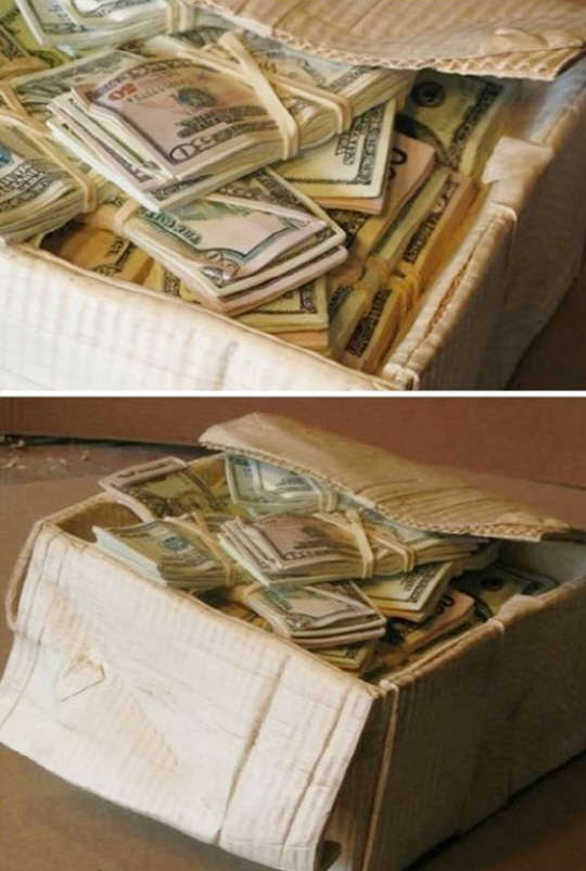 공개된 사진에는 종이 상자 안에 돈다발 뭉치들이 수북이 쌓여있다.