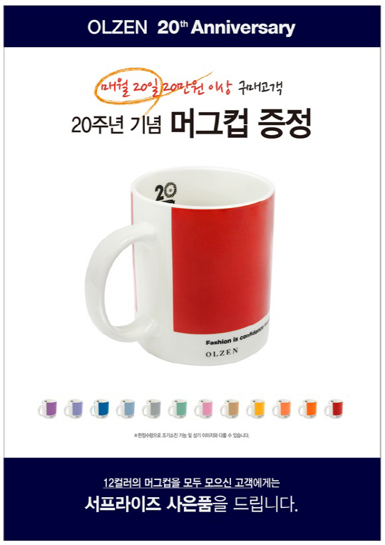 오는 20일에 시작되는 이번 이벤트는 올젠 전국매장에서 20만원 이상 구매 고객들에게 20주년을 기념 머그컵을 증정한다. 또 매월 20일 새로운 컬러로 머그컵 증정 이벤트도 진행된다. 매달 머그컵 이벤트는 2014년 연말까지 각기 다른 컬러의 머그컵 12개를 모두 모은 고객에게 특별한 선물을 선사하는 이벤트다.