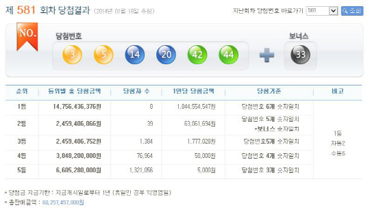 당첨번호 4개를 맞힌 4등은 7만6964명으로 고정 당첨금 5만원, 당첨번호 3개가 일치한 5등은 132만1056명으로 5000원씩 받게된다.