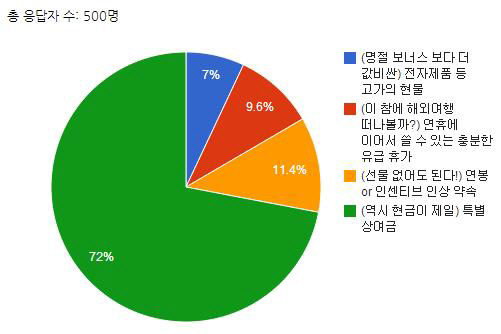설문조사는 20~40대 남녀 직장인 500명을 대상으로 실시됐다. 조사 결과 직장인 회사로부터 가장 받기 원하는 선물은 현금 형태의 특별상여금이었다. 반면 가장 받기 싫은 선물은 생필품 선물세트로 나타났다.