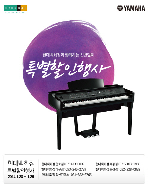 세계적인 악기음향전문기업 야마하뮤직코리아㈜는 현대백화점과 함께 2014년 새해를 맞이해 대대적인 할인 행사를 실시한다. 2014년 새해 새로운 출발을 응원하기 위해 마련된 이번 특별 행사는 특히 우리아이에게 피아노 교육을 통해 음악 감성을 심어주고자 하는 젊은 부모님들에게 더할 나위 없이 좋은 기회가 될 전망이다.