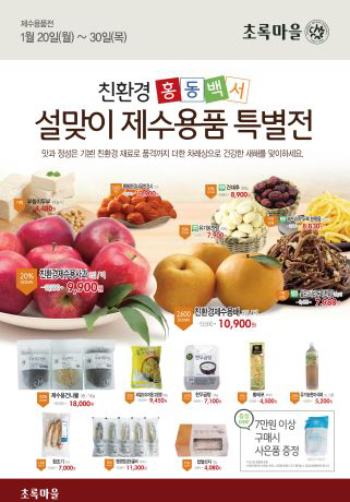 친환경 유기농 브랜드 초록마을(대표 박용주, www.choroc.com)은 알뜰 '제수용품 기획전'을 오는 30일까지 진행한다. 소비자들의 물가 부담을 줄인다는 취지에서다.