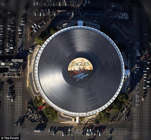 공개된 사진은 미국 캘리포니아 잉글우드에 위치한 아레나 '포럼(The Forum)'의 지붕이 레코드판 모습을 하고 있다.