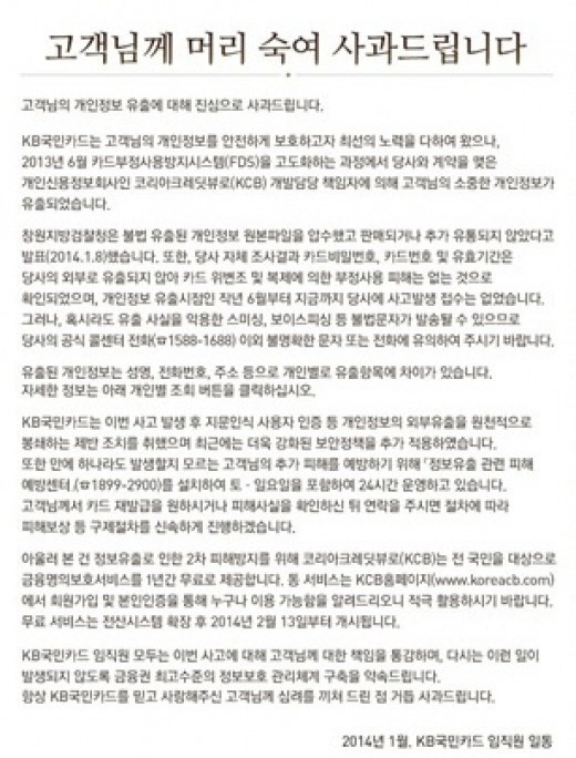 한편, 이날 오전 서울 중구 코리아나 호텔에서 열린 기자회견에는 심재오 KB국민은행 사장, 박상훈 롯데카드 사장, 손경익 NH농협카드 분사장이 참석해 "카드사 정보 유출로 인한 2차 피해는 매우 미미할 것"이라고 강조, 공통적으로 신용카드 사용 내역에 대한 무료 문자 서비스와 24시간 피해예방신고센터를 운영해 피해에 대해서 전액 보상할 것을 약속했다. <스포츠조선닷컴>