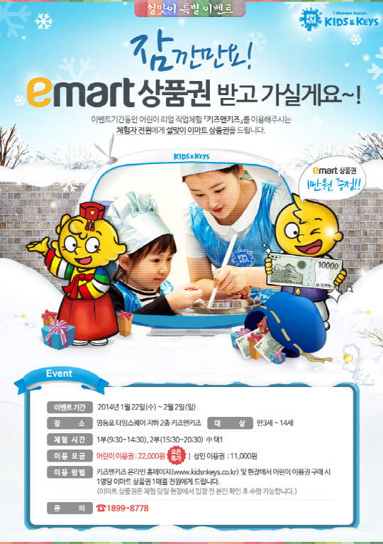 오픈을 기념해 키즈앤키즈는 설을 맞아 키즈앤키즈를 방문하는 어린이들과 가족들에게 파격적인 특별 이벤트를 실시한다. 키즈앤키즈 이용 어린이 유료 체험자 전원에게 이마트 상품권 1만원권을 제공하는 프로모션을 진행한다. 온라인 예매 및 현장에서 본인 확인 후 상품권을 받을 수 있다. 이번 이벤트는 22일부터 2월 2일까지 진행된다.