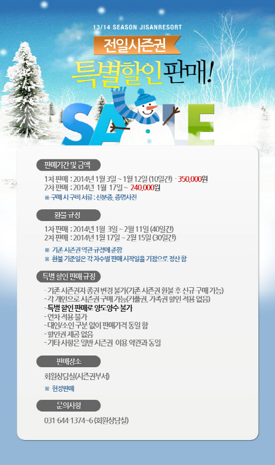 지산 포레스트 리조트(이하 지산리조트)가 13/14년 시즌권 특별 할인판매를 실시한다. 지산리조트 전일시즌권 2차 특별할인은 정상가보다 52% 할인된 가격에 판매된다. 이는 지난 1월 중순까지 판매되었던 1차 특별할인가보다도 30% 가량 저렴한 금액으로 본격적인 스키 시즌에 내방객들이 부담 없이 스키, 보드를 즐길 수 있도록 고려한 것이다.