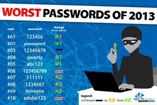 이는 비밀번호 관리 전문회사 스플래시데이터(splashdata)가 공개한 '2013년 최악의 비밀번호 25개 목록'으로 최악의 비밀번호 1위에는 '123456'이란 숫자가 2년 연속 1위를 지켰던 'password'를 제치고 영광을(?) 차지했다.