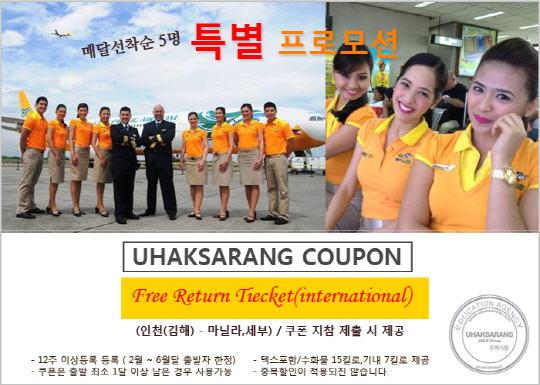 필리핀어학연수 최고의 커뮤니티를 자랑하는 네이버카페 유학사랑(http://cafe.naver.com/nanada77)이 2월 내 등록 신청서 접수조건으로 필리핀 왕복항공권을 제공하는 행사를 벌인다. 어학연수를 준비 중이던 학생들에게는 비용절감과 함께 어학연수를 다녀올 수 있는 좋은 기회이다.