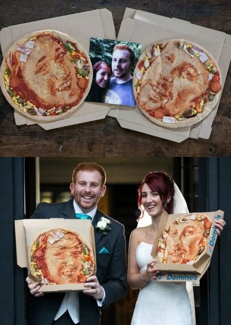 공개된 사진 속에는 피자 재료를 이용해 얼굴을 만든 초상화 피자를 들고 있는 신랑 신부의 모습이 담겨있다.