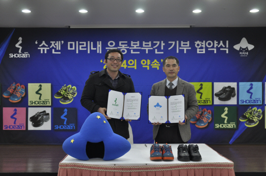 슈젠은 23일 부산 범천동 부산상공회의소에서 미리내운동본부(대표 김준호, www.mirinae.so)와 슈젠이 생산한 2014켤레의 신발을 무상 후원하는 내용의 업무협약(MOU)을 체했다. 슈젠은 미리내운동본부가 진행해온 사회공헌사업에 동참하는 차원에서 물품을 기증하기로 결정했다.