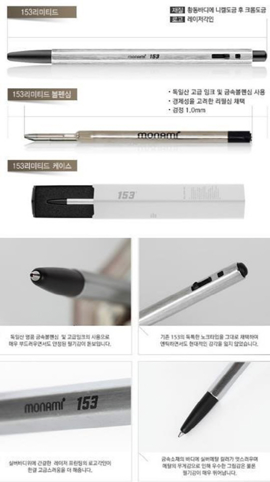 또 모나미 153 한정판 볼펜은 블랙 내장재에 감싸 있어 충격에도 잘 견디고, 모던함과 간결함을 더했다. 모나미 153 한정판의 정식 명칭은 '모나미 153 리미티드 1.0 블랙'이며 1만개 한정 제작·판매된다.