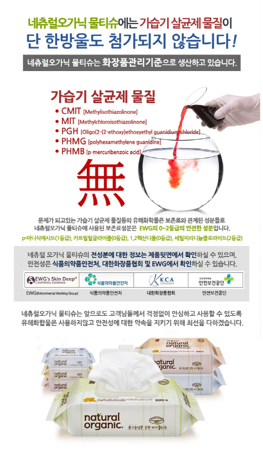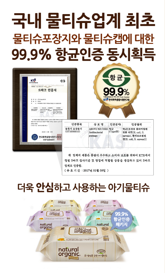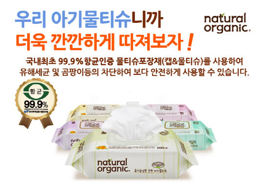 '네츄럴오가닉물티슈'는 99.9% 자연유래성분으로 만들어진 순한 아기물티슈로서 미국의 비영리 단체 EWG(Environmental Working Group)의 안전성테스트에서 안전한 녹색등급인 0~2등급의 천연항균성분과 보존료를 사용한 제품이다. 또한 미국 FDA(미국 식품의약국) 및 EPA(미국 환경보호청)으로부터 승인받은 원료를 사용하여 안전도를 높였다. 항곰팡이 기능까지 추가하여 유해세균 및 곰팡이 등을 원천적으로 차단해 소비자들이 더욱 안전하게 보관하면서 사용할 수 있게 되었다고 밝혔다.