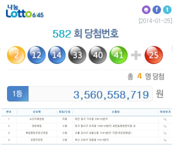 지난 25일 발표된 나눔로또에 따르면 제582회 1등 당첨번호 번호는 '2, 12, 14, 33, 40, 41'이며, 2등 보너스 번호는 '25'다.